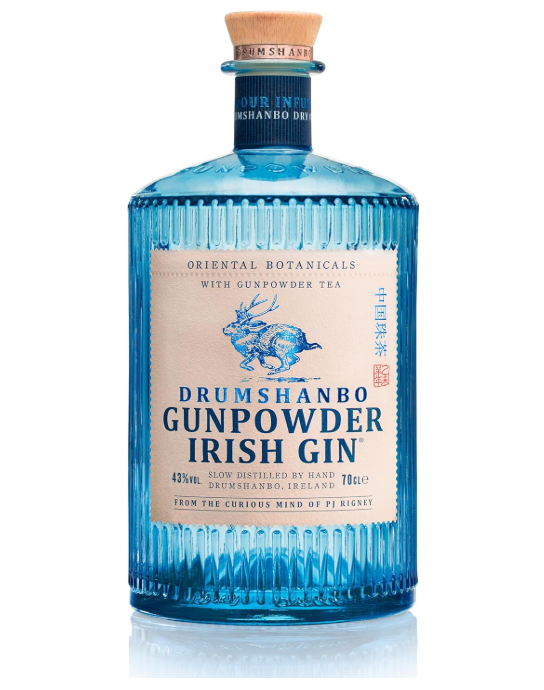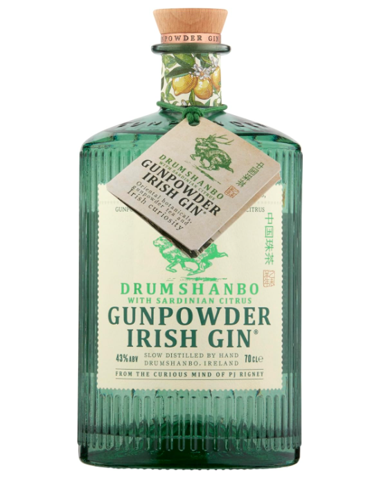 Drumshanbo Gunpowder Irish Gin. Slow distilled and handmade from 11 botanicals including oriental spices and gunpowder tea. Fresh citrus notes with spice. Gin with a fresh citrus taste and spicy notes of oriental botanicals. Gunpowder gin is a green tea that has been slowly dried, the delicate leaves then carefully rolled into shiny pellets. The flavour is bold and bright with a slight spicy freshness. (ABV 43%)