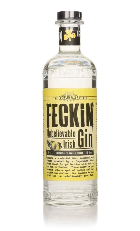 Feckin Irish Gin. The latest addition to the FECKiN range and long awaited by fans of this unique brand. FECKiN Gin is a gin with citrus and herbaceous notes from the nose through to the finish. Delicate candied lemon aromas begin the journey with juniper undertones and lemon sherbet. There’s an initial bitterness on the tongue as your taste buds switch from lemon and coriander and back again. The flavour develops to a delicate finish with tones of lemon butter cream. (ABV 40%)